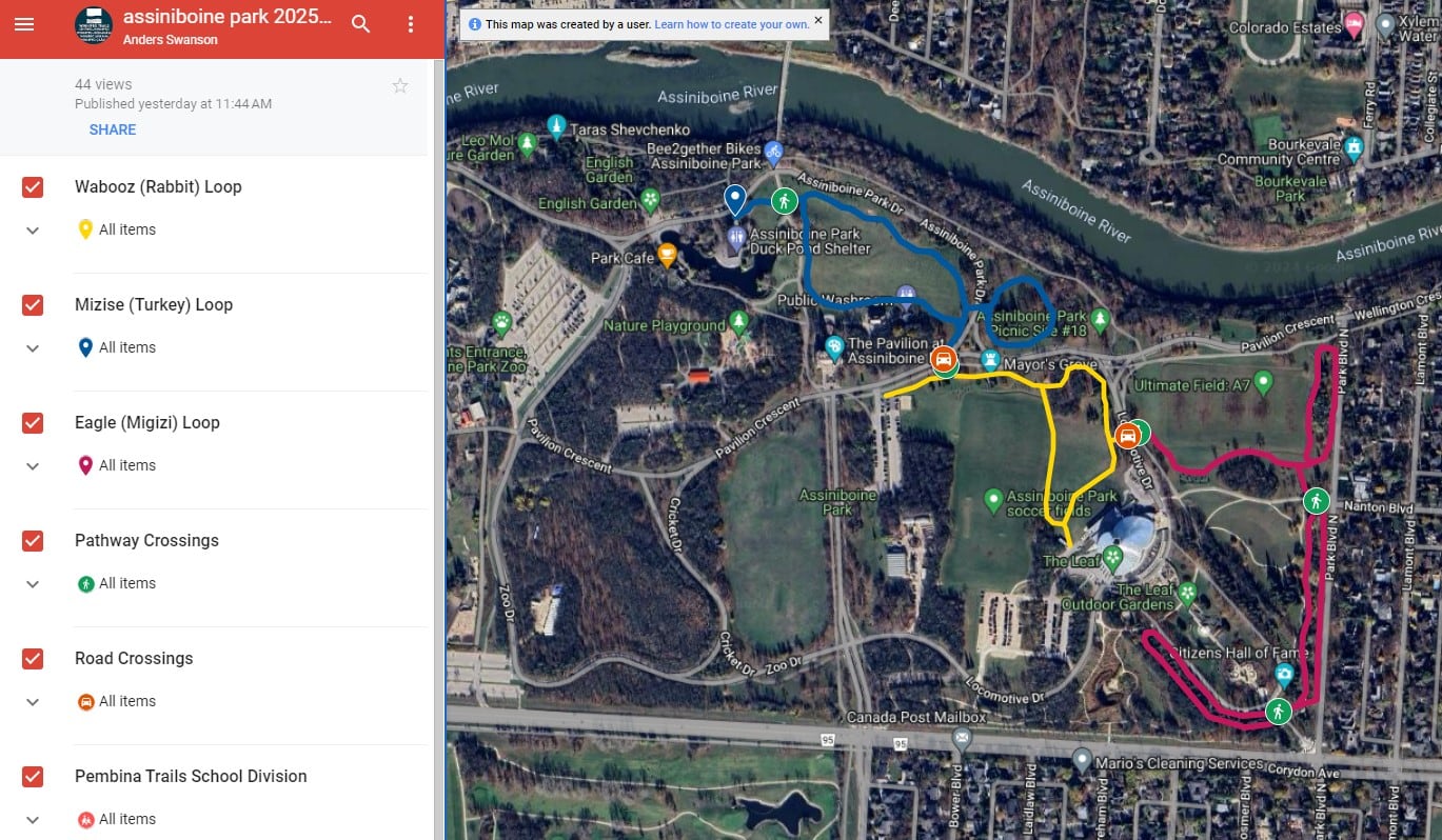 - Trail map: In recognition of the Indigenous history of the land we now know as Assiniboine Park, each ski loop has been given a name in English and Ojibwe corresponding to local wildlife: 1) Eagle / Migizi loop, 2) Rabbit / Waabooz loop, and 3) Turkey / Mizise loop.