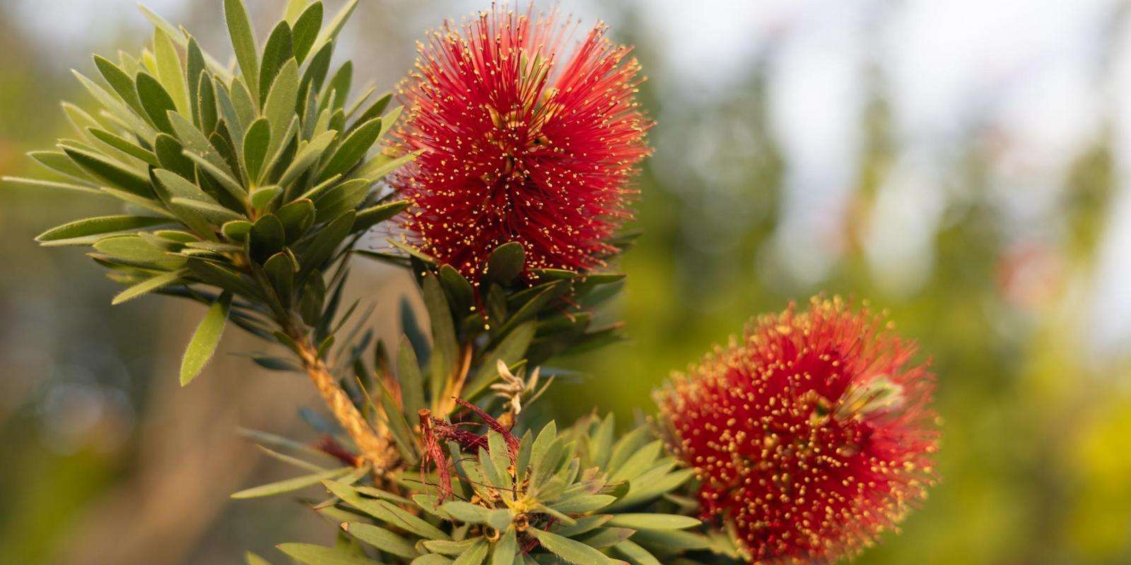 Bottlebrush (Callistemon) (above) is an Australian native shrub that often grows in wet areas like creek beds or areas prone to flooding. It gets its name from its striking resemblance to a household bottle brush. This plant’s dark green leaves are covered in tiny oil glands with a mint scent.